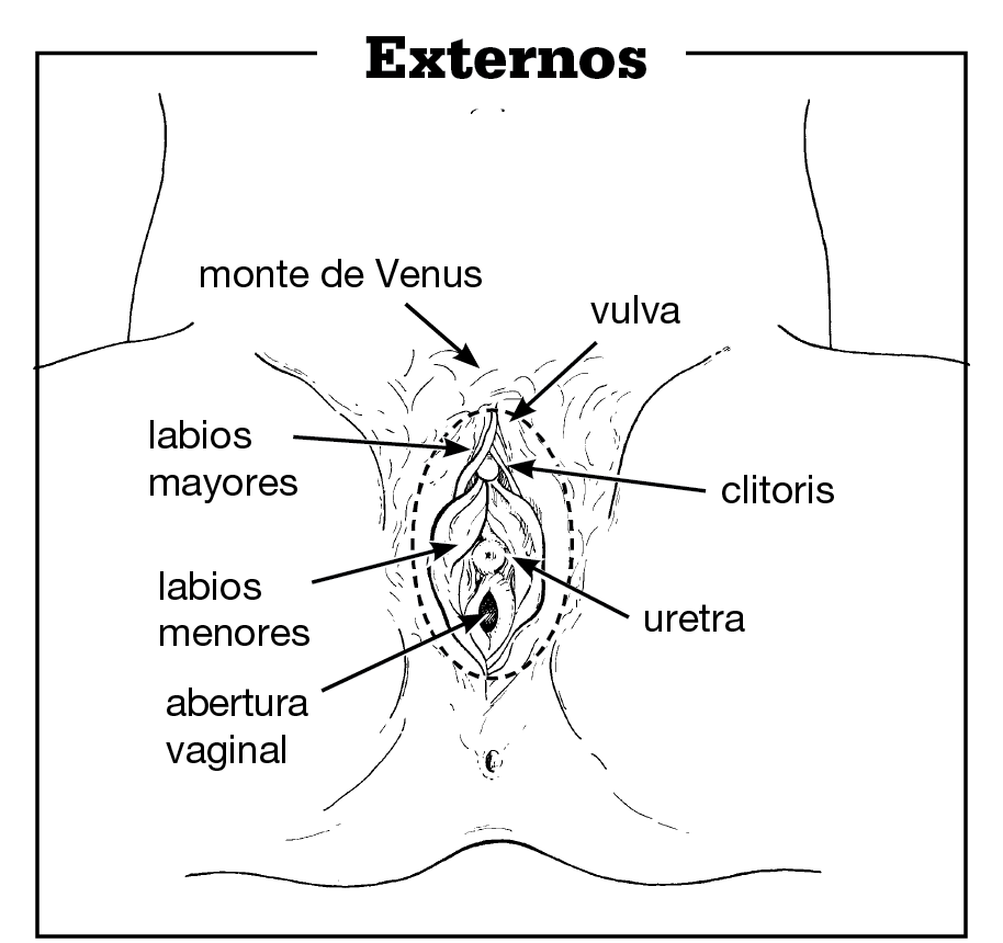 - Vulva, que es el término global para los genitales externos, indicada por una línea punteada que rodea las imágenes de los órganos