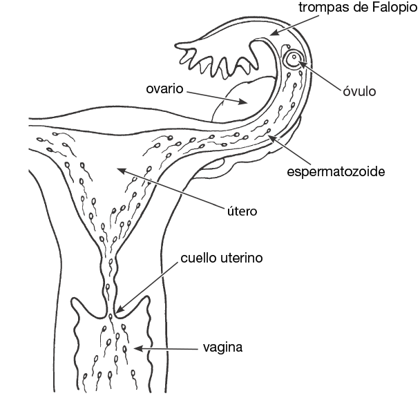 Diagrama del aparato reproductor en un cuerpo con una vagina que muestra cómo se fecunda un óvulo. El útero se muestra con una de las trompas de Falopio saliendo del costado con un ovario detrás. Hay un óvulo, representado por círculos concéntricos, en la parte superior de una de las trompas de Falopio, justo detrás de las proyecciones en forma de dedos en su extremo. Muchos espermatozoides, representados como puntos con una línea ondulada como cola, que parecen pequeños renacuajos, se muestran moviéndose hacia arriba a través de la vagina y el cuello uterino o abertura del útero, y luego dividiéndose en dos grupos que viajan a cada lado del útero. El grupo que viaja hacia la trompa de Falopio que se muestra a la derecha ha llegado al óvulo.