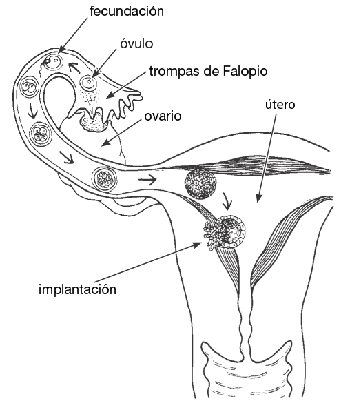 Diagrama que muestra las diferentes etapas del desarrollo de un óvulo a medida que viaja por la trompa de Falopio y hacia el útero después de ser fecundado. Se muestran el útero y una trompa de Falopio con un ovario detrás. Hay una abertura en el ovario justo debajo de las proyecciones en forma de dedos al final de la trompa de Falopio con líneas que indican que se ha liberado un óvulo representado como simples círculos concéntricos. Una flecha apunta a la siguiente imagen de un solo espermatozoide que ingresa al óvulo en el momento de la fecundación. La siguiente versión del óvulo lo muestra más adelante en su recorrido por la trompa de Falopio con dos nuevos círculos concéntricos dentro del círculo exterior para indicar que las células han comenzado a dividirse. Una flecha apunta a la siguiente versión del óvulo, más adelante en la trompa de Falopio, ahora con cuatro células en su interior. Otra flecha apunta al óvulo que se muestra aún más adelante en la trompa de Falopio y que ahora está lleno de células más pequeñas. La siguiente flecha apunta al óvulo que ingresa al útero y ahora es más grande y está completamente lleno de células más pequeñas. La flecha final apunta al óvulo que descansa contra el revestimiento del costado del útero, con una capa de células alrededor de su circunferencia y otras células que salen del óvulo y entran en el revestimiento uterino para mostrar el momento de la implantación cuando el óvulo fecundado se incrusta en el revestimiento del útero y comienza un embarazo.