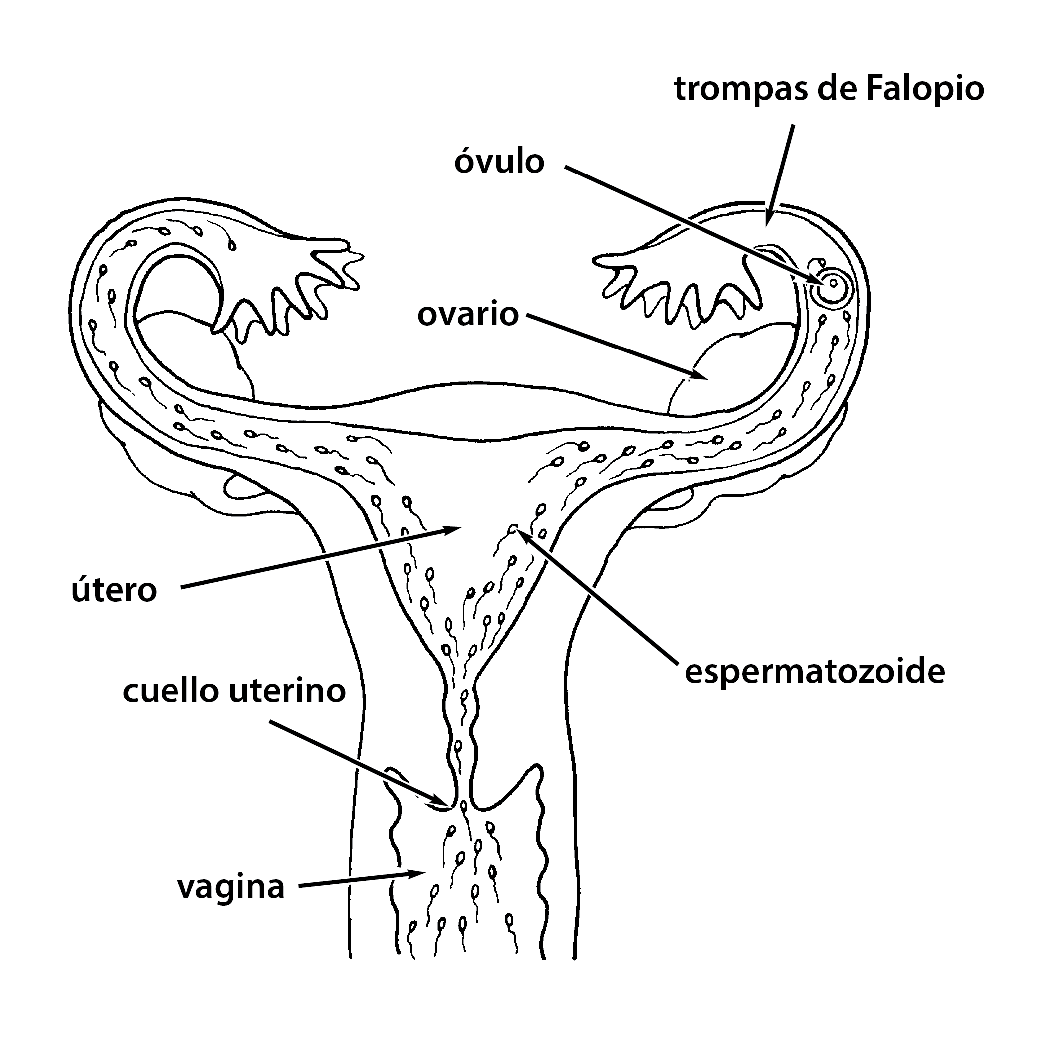 Diagrama del aparato reproductor en un cuerpo con una vagina que muestra cómo se fertiliza un óvulo. Se muestra al útero con una trompa de Falopio a cada lado con un ovario situado detrás de cada una. Hay un óvulo, representado por círculos concéntricos, en la parte superior de una de las trompas de Falopio, justo detrás de las proyecciones en forma de dedos en su extremo. Muchos espermatozoides, representados como puntos con una línea ondulada como cola que parece un pequeño renacuajo, se muestran moviéndose hacia arriba a través de la vagina y el cuello uterino o abriéndose paso hacia el útero, y luego dividiéndose en dos grupos que viajan a cada lado del útero. El grupo que viaja hacia la trompa de Falopio que se muestra a la derecha ha llegado al óvulo.